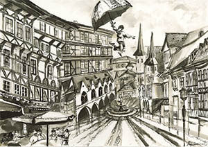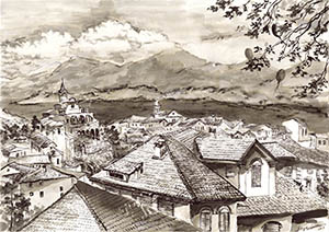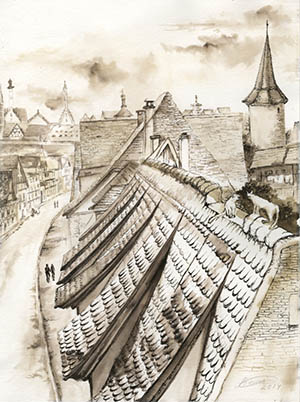 The Roofs of Rottenburg. Ink on Paper, 12 x 16