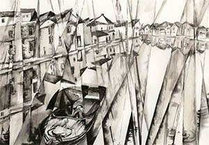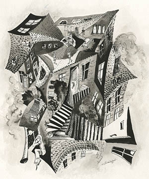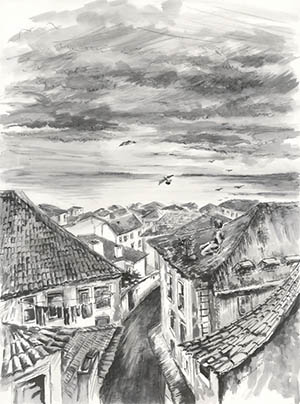 The Roofs of Lisbon, Portugal. Ink on Paper, 18 x 24